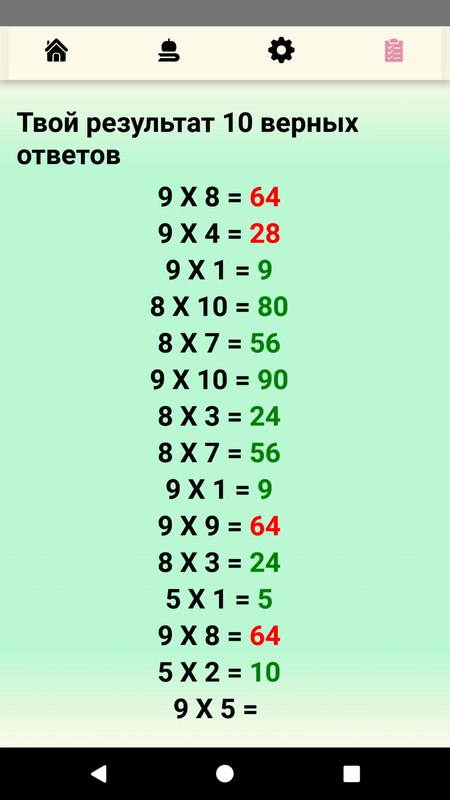 По окончании времени отведенного для ответов на экране отобразится количество верных ответов, ошибки подсветятся красным.