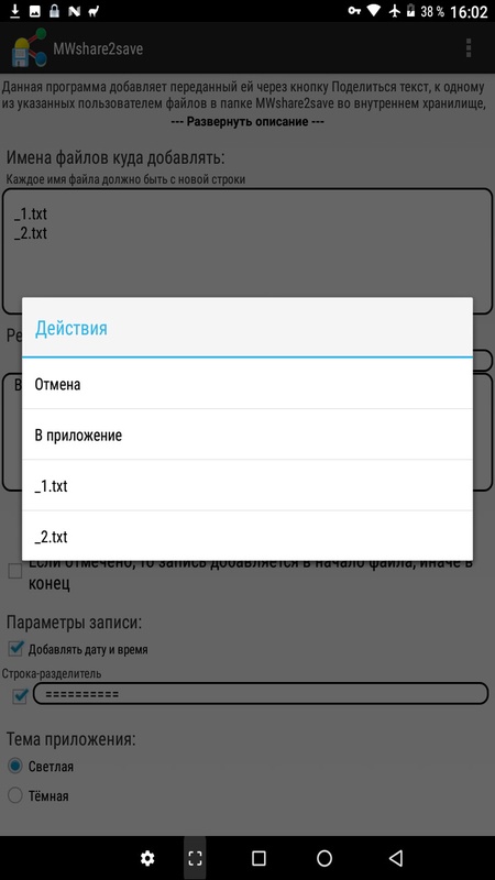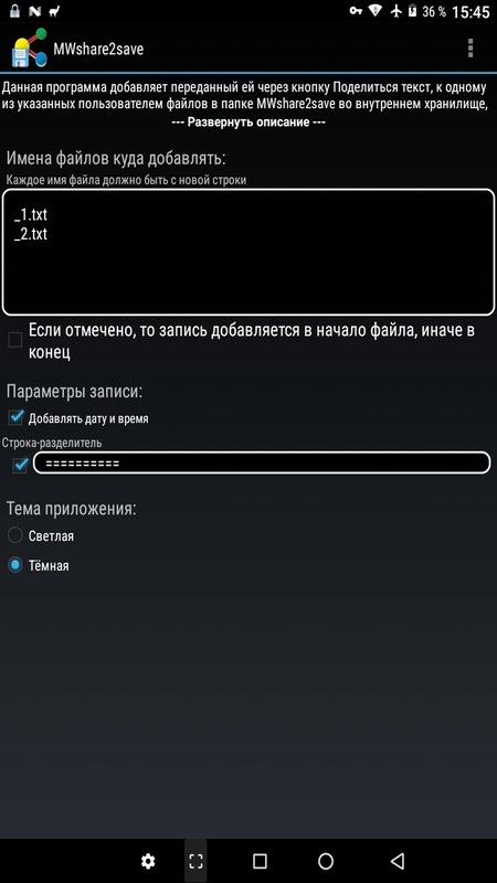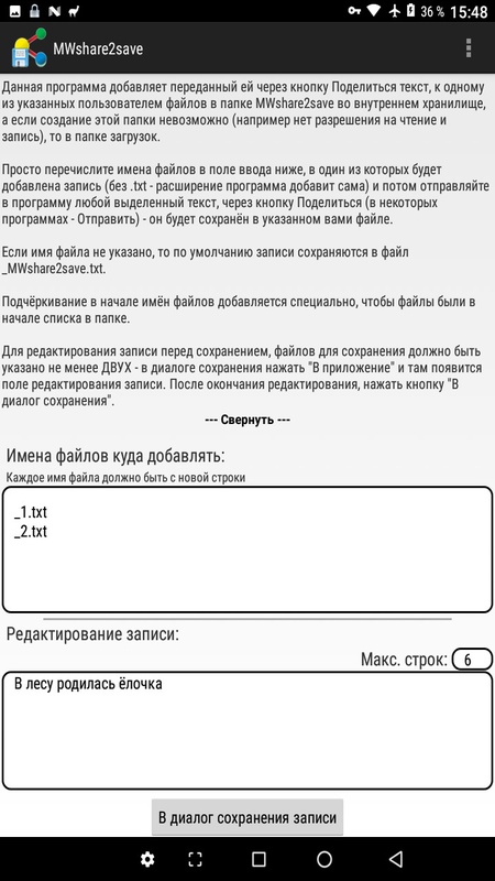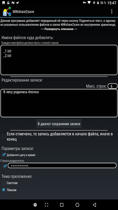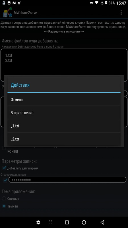 MWshare2save, это небольшая программа, которая сохраняет полученный текст в выбранный файл, через кнопку Поделиться (share).