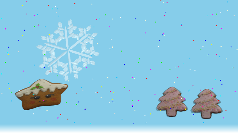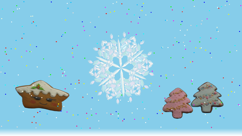 На экране отображается домик, елочки и летающие снежинки разной формы