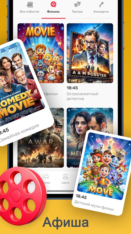 Смотрите расписание кинотеатров, театров и концертов с указанием времени проведения и стоимость.