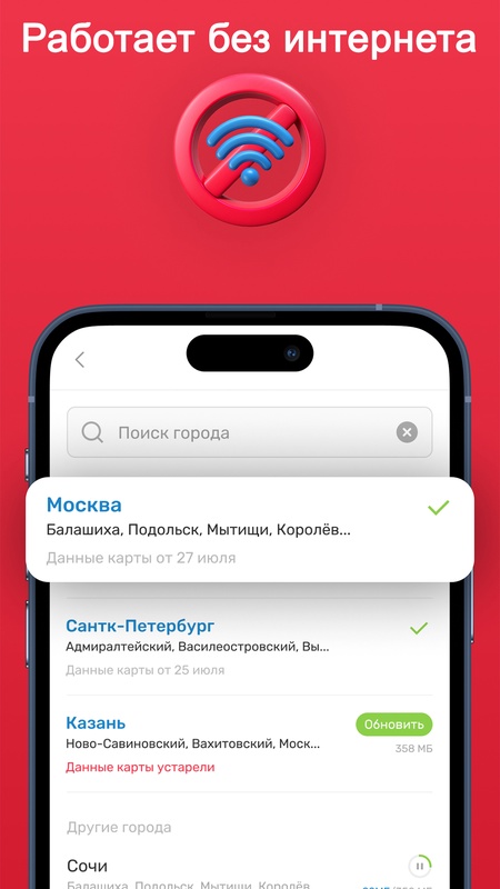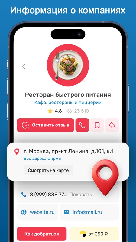 Вы всегда можете сохранить понравившееся вам фирму или место нажав на кнопку «В Избранное». Раздел «Избранное» у вас всегда под рукой в нижней части экрана. Избранное можно смотреть даже при отсутствии подключения к интернету.
