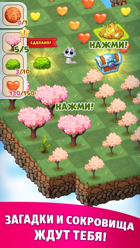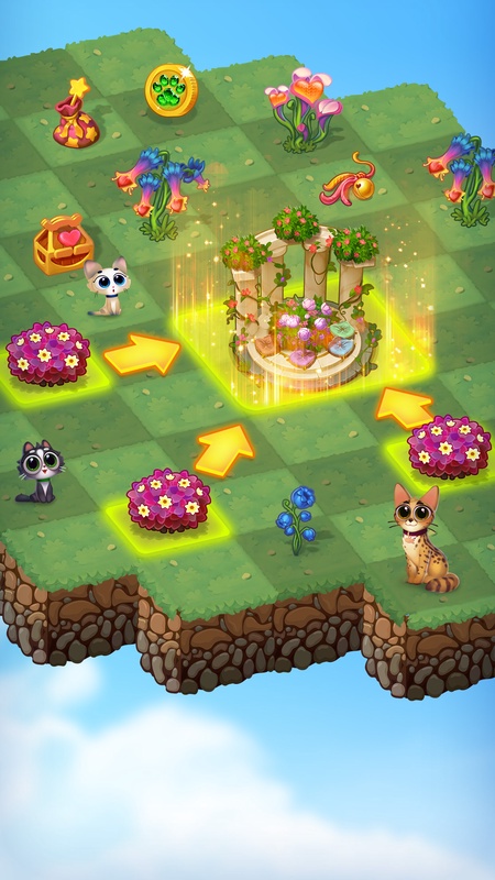 Слияние трех в ряд сломанных кошачьих домиков ускорит ремонт жилища твоих любимых пушистиков. Открывай новые области кошачьего мира, излечивай земли, собирай цветы и деревья, чтобы получить новые виды растений для строительства сада своей мечты .