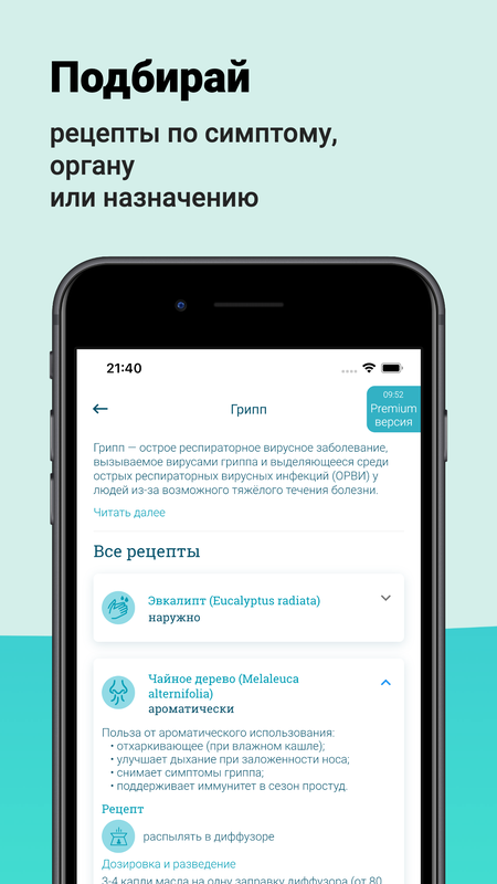 • Поиск поможет найти нужный вариант использования по ключевому слову, например "грипп", "масло лимона" или "успокоиться"