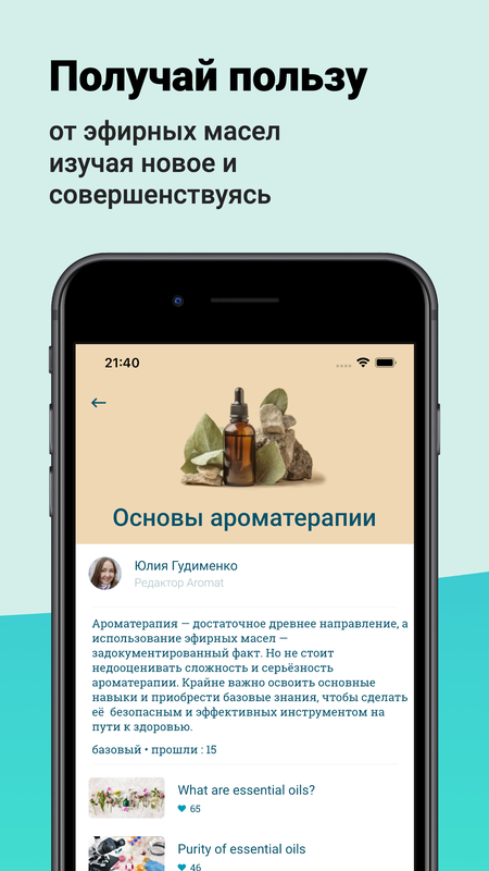 Установите Aromat и пользуйтесь всеми преимуществами современных разработок, чтобы узнавать новое, чувствовать себя комфортно, применять эфирные масла для себя и своей семьи.