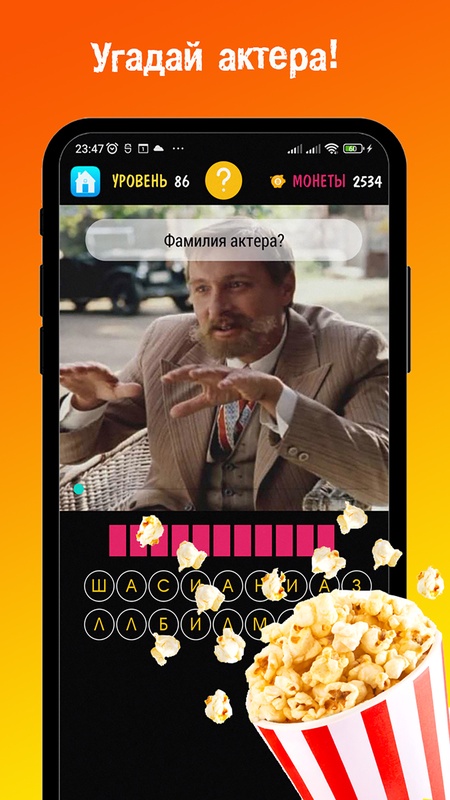 Наши фильмы - фотовикторина это увлекательная игра по мотивам Советских и Российских фильмов. В игре вам предстоит угадать название фильма, актера, актрису, имя героя, режисера или съемки какого фильма происходят на фото. Чтобы игра не была слишком простой, изначально фото размыто. Выв можете уменьшить размытие передвигая ползунок внизу фотографии, но при это будут списываться монеты, полное снятие размытия стоит 100 монет, но пусть это вас не смущает, если монеты закончатся, вы всегда сможете их пополнить, посмотрев короткое видео или поделившись ссылкой на игру в соцсетях. Если вы не можете угадать, что или кто на фото, используйте подсказки; открыть букву, убрать лишние или пропустить уровень. После прохождения очередного уровня игры вы можете узнать более подробную информации о фильме, актере или режиссере, нажав на кнопку (i), рядом с фото. На момент выпуска игры в ней доступно 140 уровней, но если игра - Наши фильмы вам понравится, мы будем добавлять уровни постоянно. Очень увлекательно играть с друзьями или всей семьей, как говориться - "Одна голова хорошо, а две лучше!"