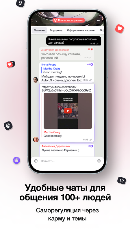 * Индивидуальные настройки уведомлений: читайте только то, что действительно важно. Забудьте о тысячах уведомлений в неактуальных чатах, как это бывает в вк, тг, ватсап или других популярных мессенджерах где у вас тысячи непрочитанных сообщений, отвлекающих от действительно важного.