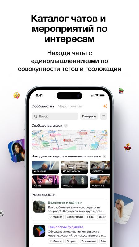 * Интеллектуальные рекомендации: наша система подберёт для вас встречи и группы, исходя из ваших интересов и контакты, и порекомендует экспертов, готовых поделиться опытом.