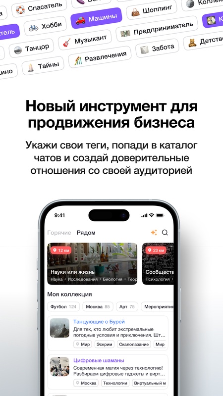 Укажи свои теги, попади в каталог чатов и создай доверительные отношения со своей целевой аудиторией. В мире продаж доверие клиентов играет решающую роль в успехе компании. 92% покупателей верят рекомендациям друзей
