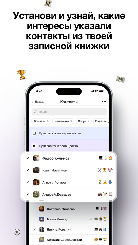 Установи и узнай, какие интересы указали контакты из твоей записной книжки. Открой для себя друзей заново