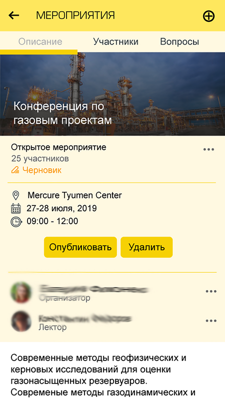 Приложение позволяет сотрудникам оперативно получать информацию и делиться впечатлениями о новостях организации, предстоящих и прошедших мероприятиях, оставлять обратную связь о прошедших лекциях.