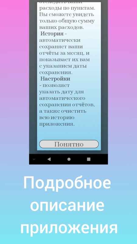 Приложение может учитывать как расходы сразу за месяц (намного удобнее, чем подробно заполнять каждый день), так и ежедневные расходы. Отчёты автоматически сохраняются по месяцам.
