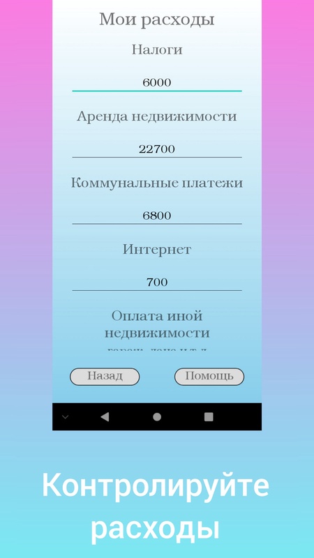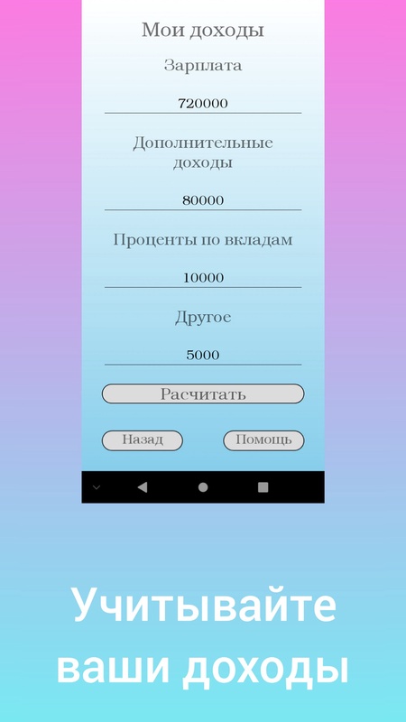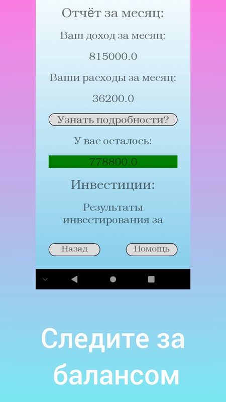 Не понимаете куда утекают деньги? Мы поможем вам разобраться. Используйте наше приложение на постоянной основе и легко сможете отследить ваши платежи, налоги, долги, постоянные траты, траты на развлечения, а так же суммировать доходы. Заполнив все поля, вы сможете получить отчет о вашем финансовом состоянии на сегодняшний день и понять куда же ушли лишние деньги.