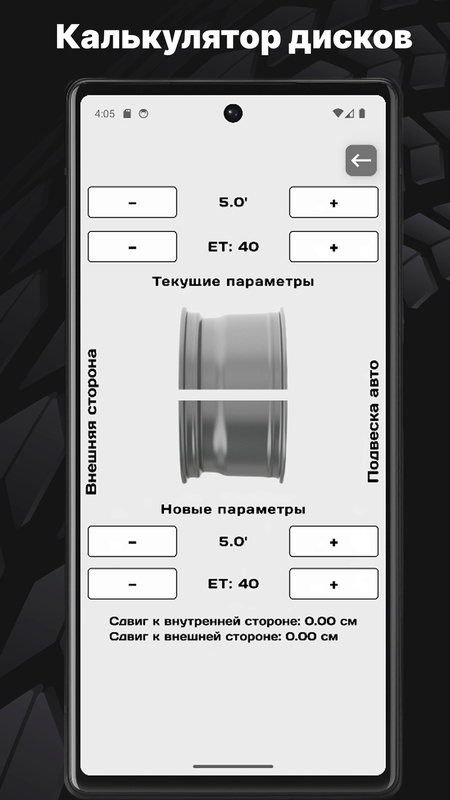 - Визуальный калькулятор ширины и вылета дисков.