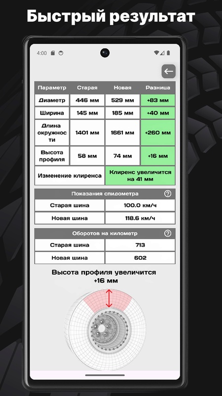 Шинный калькулятор — это удобное приложение для точного сравнения параметров старых и новых шин. Узнайте, как изменятся характеристики вашего автомобиля при замене шин, и выберите оптимальный вариант всего за несколько кликов!