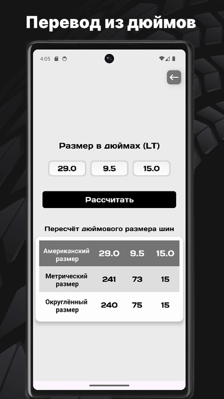 - Перевод размеров шин из дюймов в метрическую систему.
