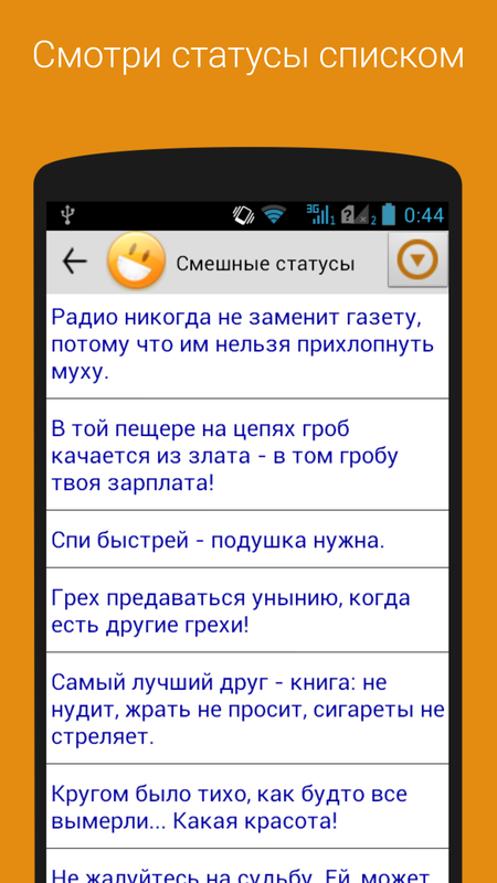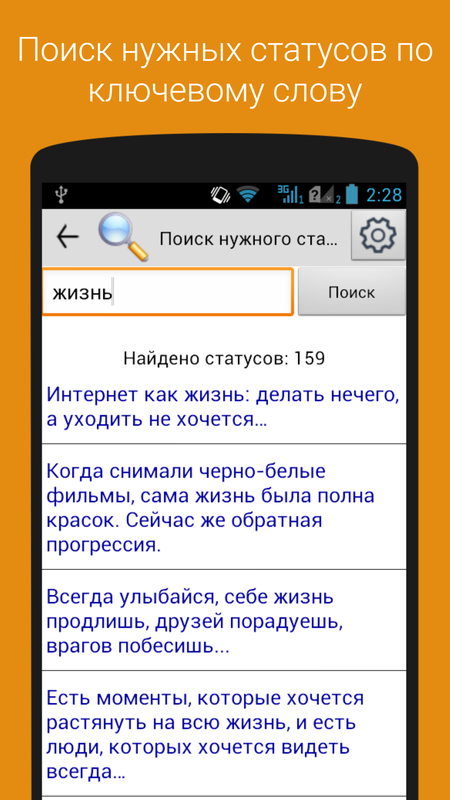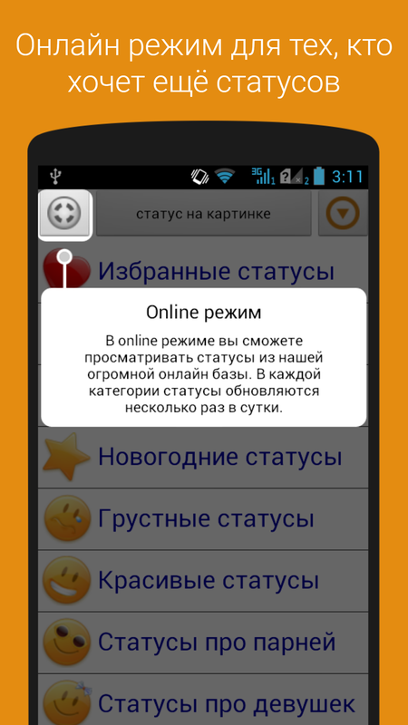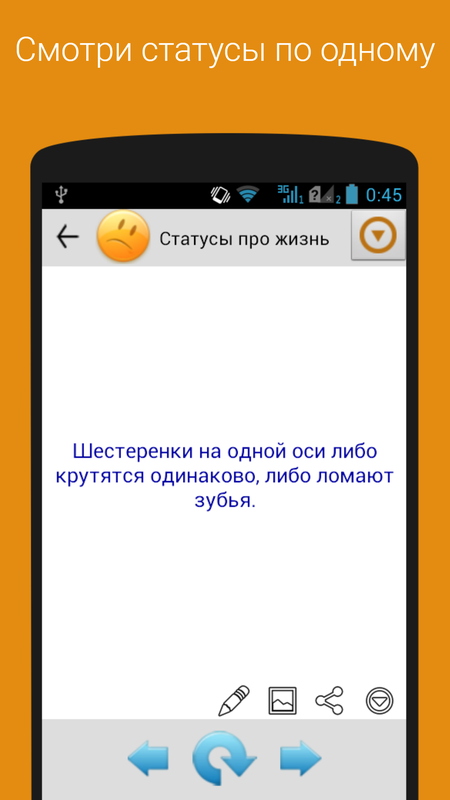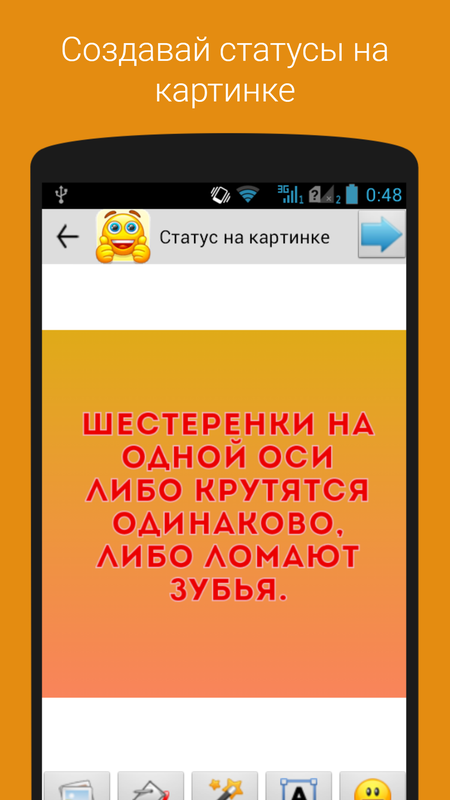 - редактировать статусы сборника и отправлять свои собственные статусы (длиной до 250 символов) в любые социальные сети и мессенджеры.