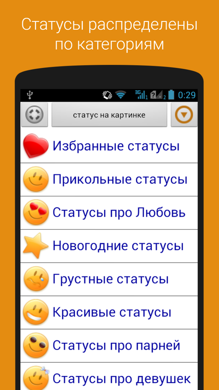 Все статусы распределены по 11 категориям: Прикольные статусы, Статусы про Любовь, Новогодние статусы, Грустные статусы, Красивые статусы, Статусы про парней, Статусы про девушек, Статусы со смыслом, Статусы про жизнь, Смешные статусы, Статусы про друзей.
