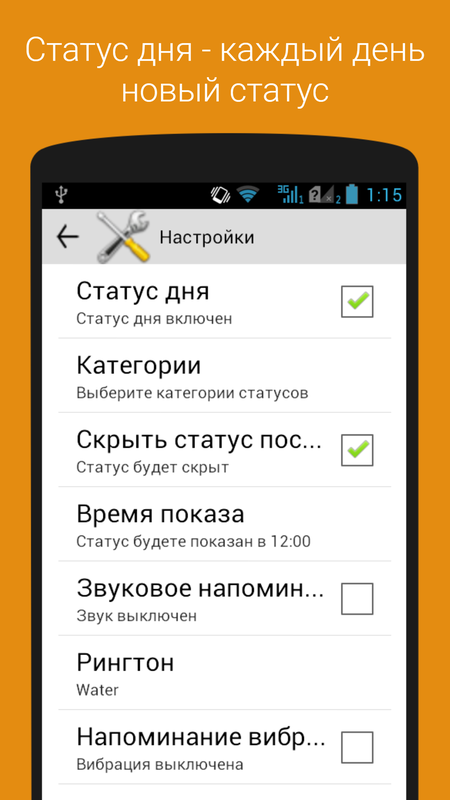 - настроить функцию "Статус дня": случайный статус из выбранных категорий в строке уведомлений Android в указанное время.