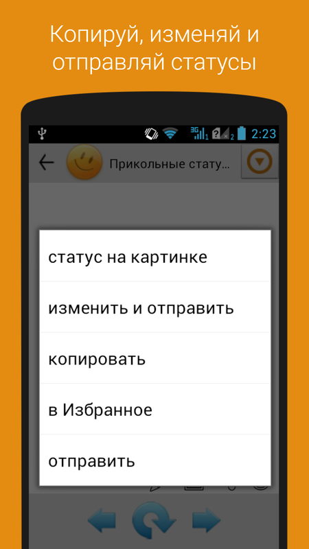 - передавать любой статус в стороннее приложение, например, в ВКонтакте, Одноклассники, Мой Мир, Facebook, Twitter или WhatsApp, текстовый редактор или в приложение для отправки смс.