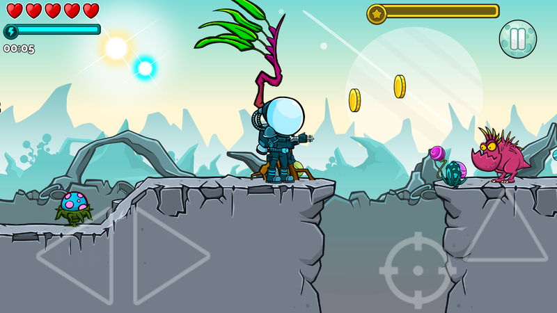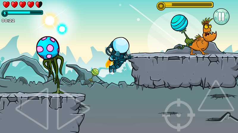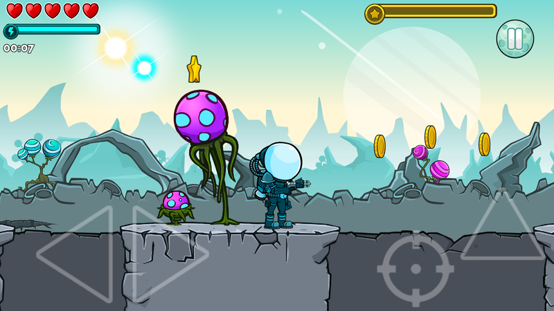 Найди лучший способ, как проходить уровни. Космонафт перелетает через пропасти и обрывы. Лети вверх как ракета, стреляй в злобных инопланетян, падай камнем вниз и опять начинай сначала.