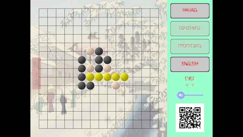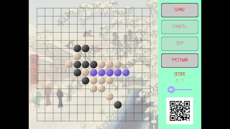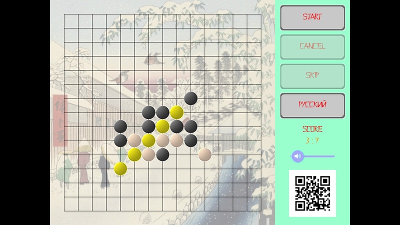 Первый ход делает компьютерный игрок, который играет черными фишками. Согласно правилам Рендзю, он должен сделать свой первый ход в центре.