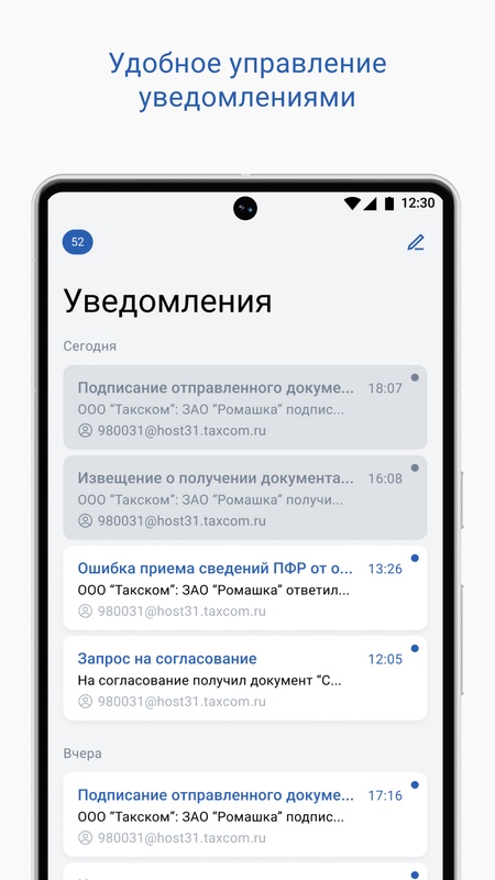 Приложение позволяет оперативно получать уведомления о входящих документах от налоговых инспекций на вашем смартфоне.