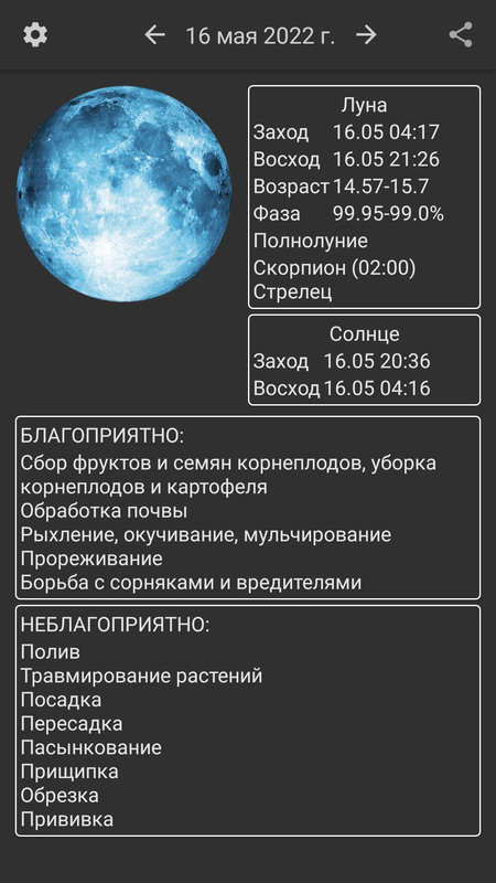 Лунный календарь садово-огородных работ, с рекомендациями на любой день, для любого местоположения. Есть возможность поделиться прогнозом.