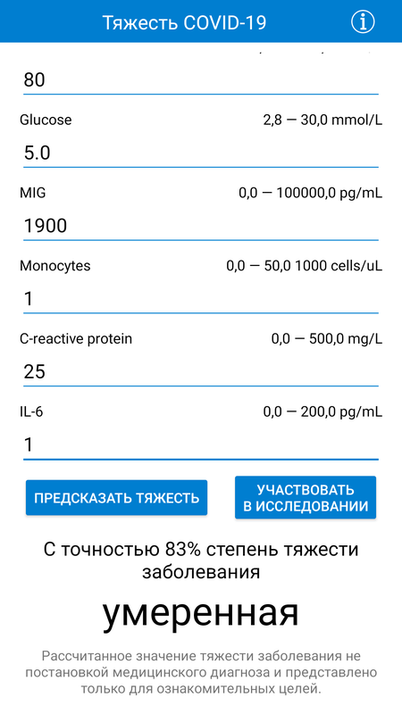 Приложение поможет предсказать степень тяжести COVID-19 на основе результатов биохимического и иммунологического анализа крови.