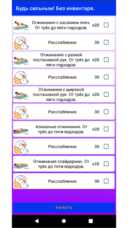 В приложении предлагается комплекс физических упражнений без инвентаря. Тренировки с собственным весом – универсальны, их можно проводить дома, на улице, в зале. В подборке эффективные упражнения с весом собственного тела для мужчин на разные группы мышц, что позволит вывести домашние тренировки на новый уровень. В приложении упражнения, которые не только помогут укрепить все группы мышц, но и нормализуют состояние позвоночника и помогут сделать красивой осанку.