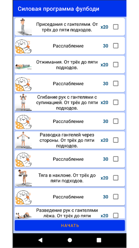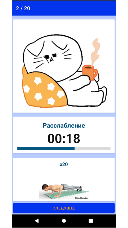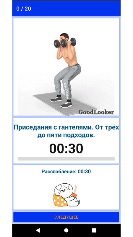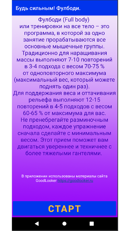Приложение показывает, как и в какой последовательности выполнять упражнения по тренировке всего тела Фулбоди (Full body), всех групп мышц в домашних условиях. Приложение озвучено, т.е. выполняющий упражнения будет слышать, когда следует начинать и заканчивать упражнение. Следуя рекомендациям, указанным в приложении за 20 занятий возможно достигнуть значительных результатов. Для улучшения достижений возможно повторное выполнение курса с увеличением нагрузки.