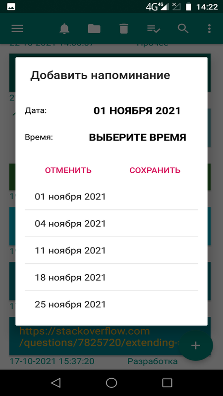 Имеется возможность установки напоминаний для выбранной заметки, установленного диапазона дат и установленного времени.