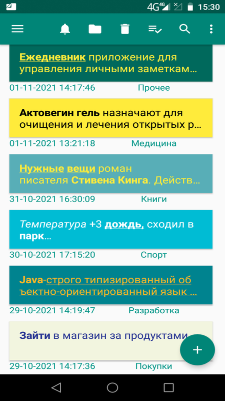 Есть функция поиска заметок по введенной подстроке, можно устанавливать отборы в списке заметок по категории и выбранному диапазону дат.