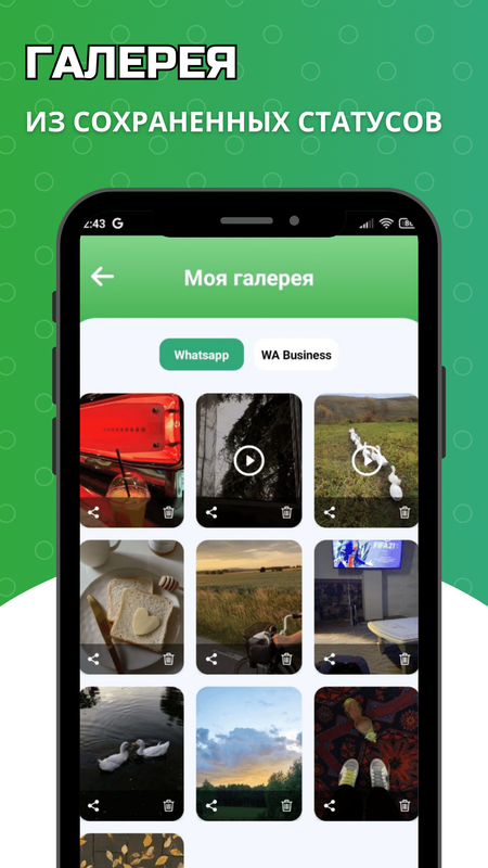🖼️ Встроенная галерея: Не нужно искать сохраненные статусы ватсап по всему телефону – наслаждайтесь ими в удобно организованной галерее внутри приложения.