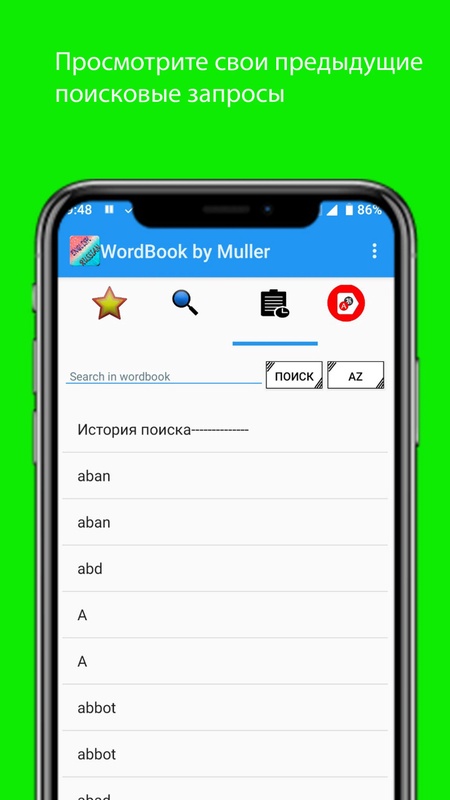 А также с помощью меню История поиска вы можете сохранять свои предыдущие слова на которые искали перевод .