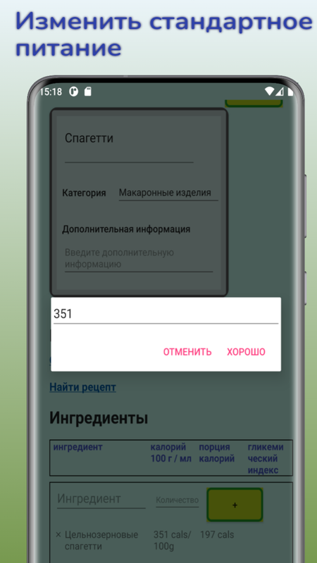 ★ Выберите ингредиент из предварительно загруженного списка или введите его с указанием калорий и ГИ (гликемический индекс)