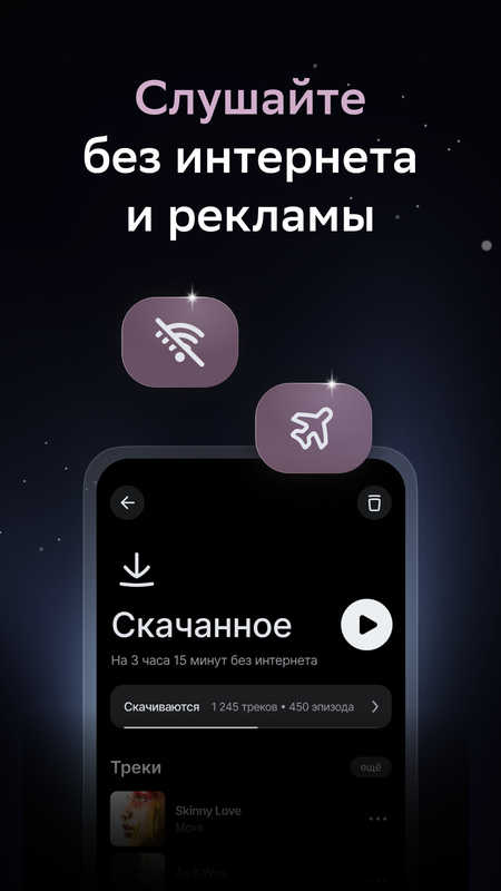 Музыкальный плеер оффлайн: возможность слушать любимые треки без интернета и подкасты без рекламы.