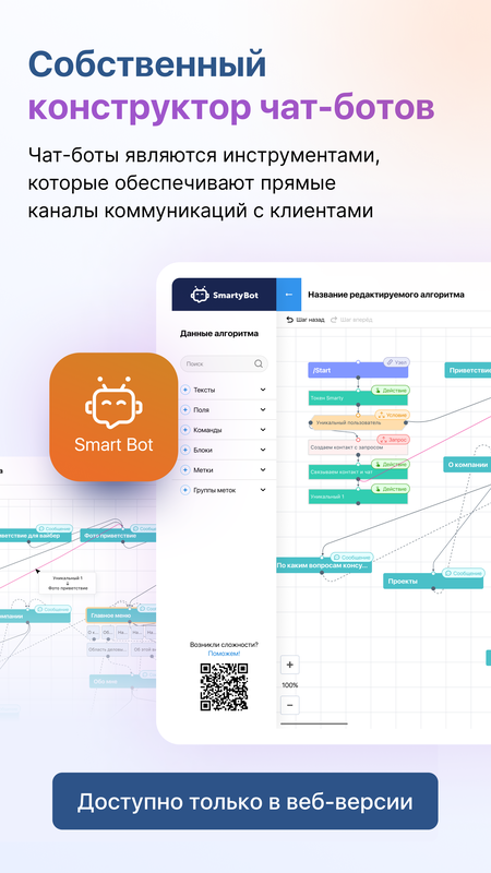 ✓собственный редактор чат-ботов (доступен только в веб-версии)и многое другое.