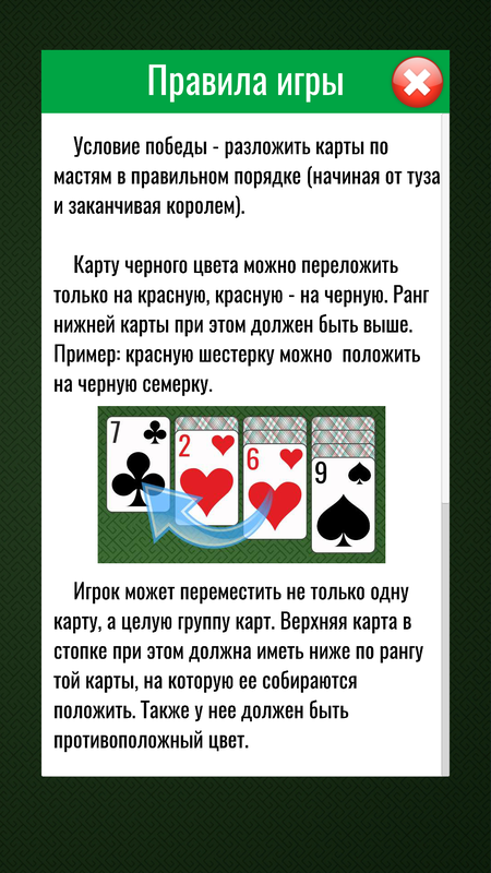 Пасьянс работает на основе классических правил – цель проста: соберите в доме все карты по порядку и масти, от туза до короля.