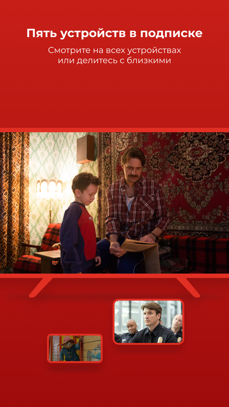 - Одна подписка — до 5 устройств — смотрите на смартфоне, планшете, Smart TV или приставке