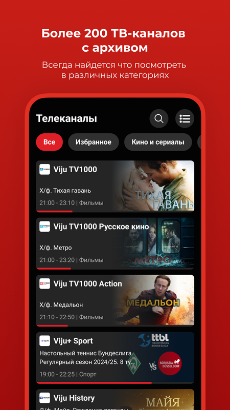 - Более 200 телеканалов — смотри Первый канал, НТВ, СТС, ТНТ и многие другие