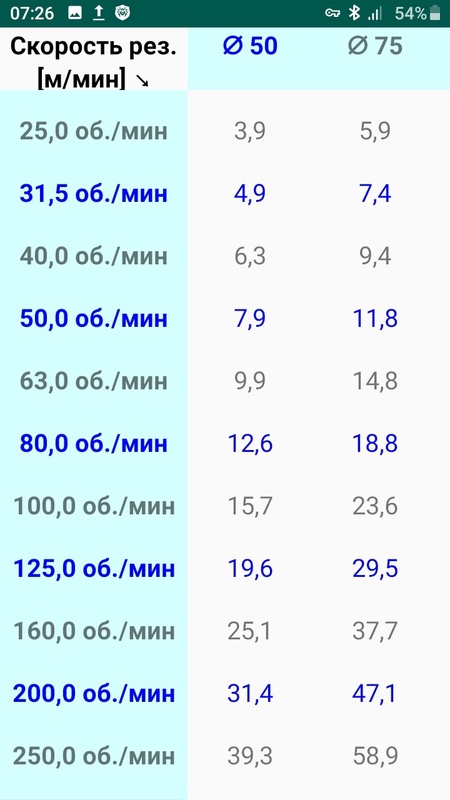 Таблица скоростей резания в метрах в минуту (от диаметра и оборотов).