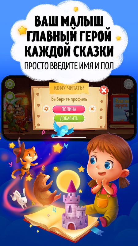 Мы позаботились о том, чтобы Ваш ребенок всегда был в центре внимания и главным героем каждой сказки. Достаточно указать имя и пол ребенка и все сказки будут о Вашем малыше и с его именем.