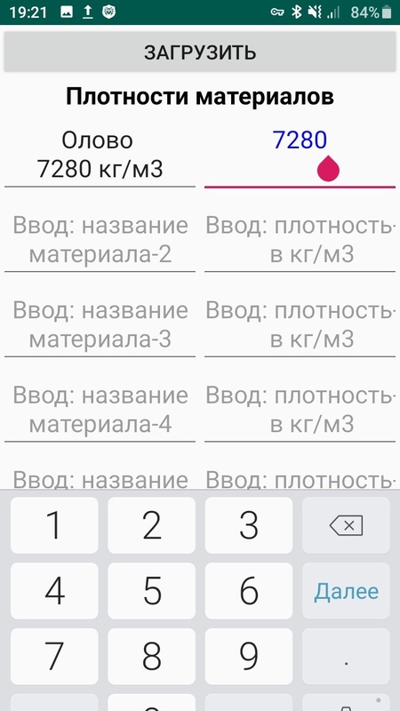 Ещё 10 материалов и плотности к ним можно ввести при переходе по кнопке [Ввод] на Экране-3.