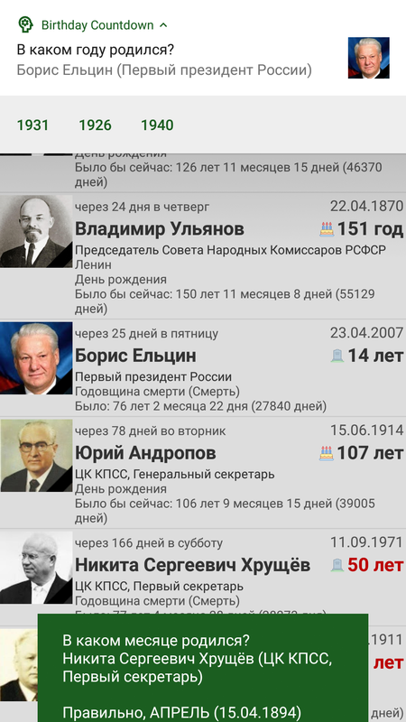 Викторина о событиях контактов: когда родился? сколько лет исполнится? в каком месяце день рождения?