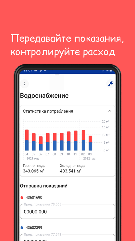 - передать показания приборов учета. Просмотреть статистику потребления по разным ресурсам, увидеть, что показания попали в бухгалтерию и будут учтены в расчетах;