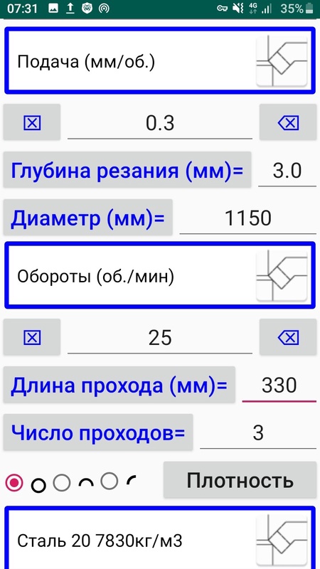 На Экране-2 производится расчёт скорости резания (и оборотов при вводе наружного диаметра ) при обработке конструкционной углеродистой стали при наружном продольном точении проходными резцами по методике из книги: "Справочник технолога машиностроителя." Москва Машиностроение 1985 год.