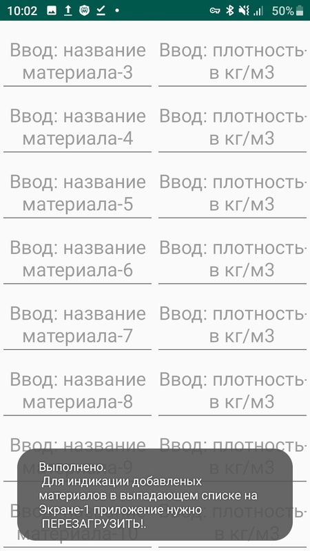 На экране-1 по кнопке [Плотность] перейти и ввести в таблицу наименование материала в левый столбец и числовое значение в правый.