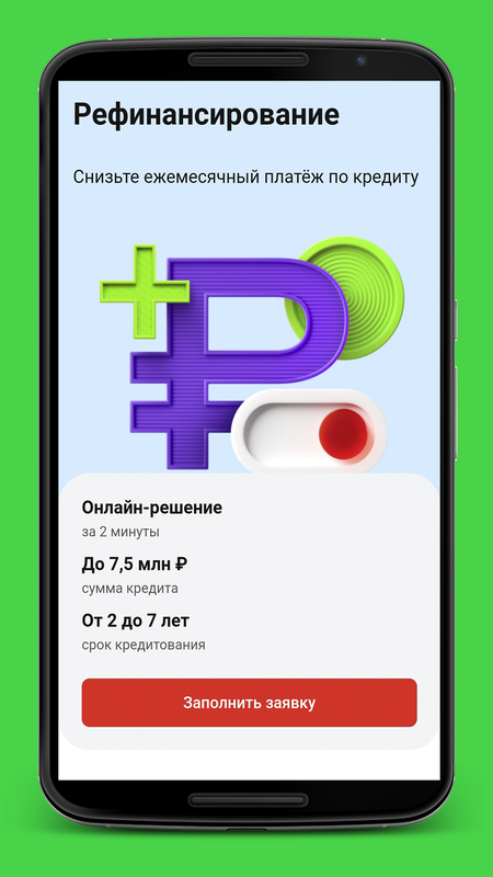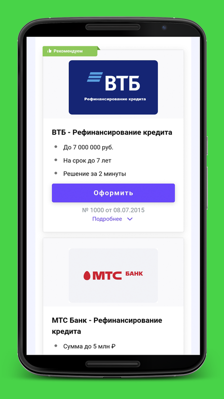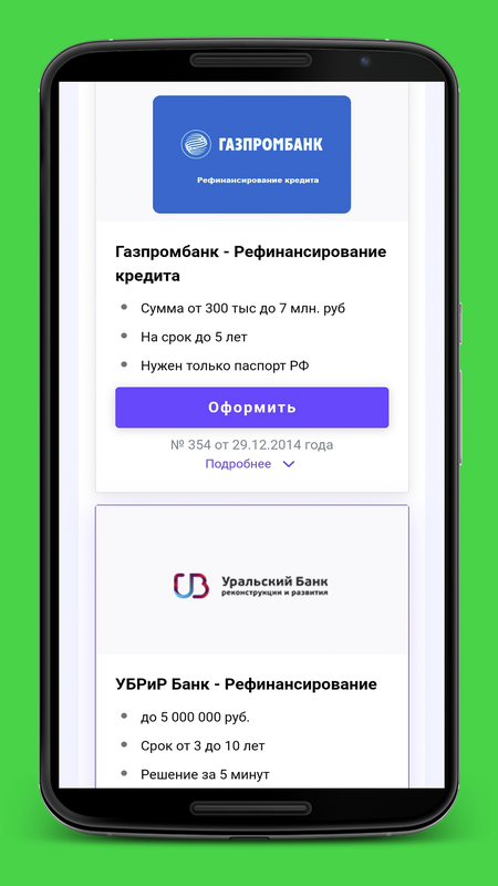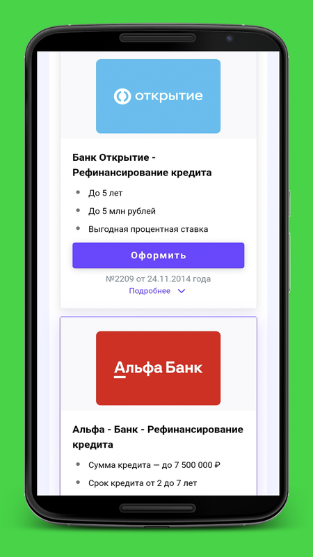 Рефинансирование кредита - это приложение для подбора банка с наиболее выгодными условиями получения нового кредита и для полного или частичного погашения старых кредитов.
