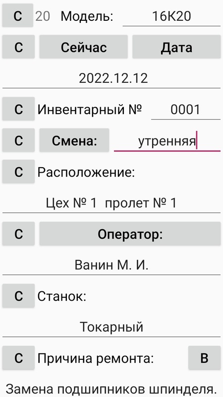 Составление и сохранение краткой заявки на ремонт (ЗР) оборудования и сохранение её в памяти приложения.