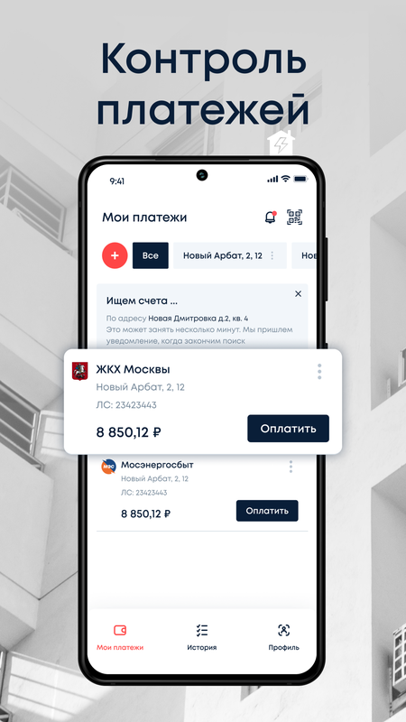 Мы создали приложение с интуитивно понятным и стильным интерфейсом, чтобы вы могли легко управлять вашими платежами и коммунальными услугами наших поставщиков ЕИРЦ Москвы и Мосэнергосбыт.